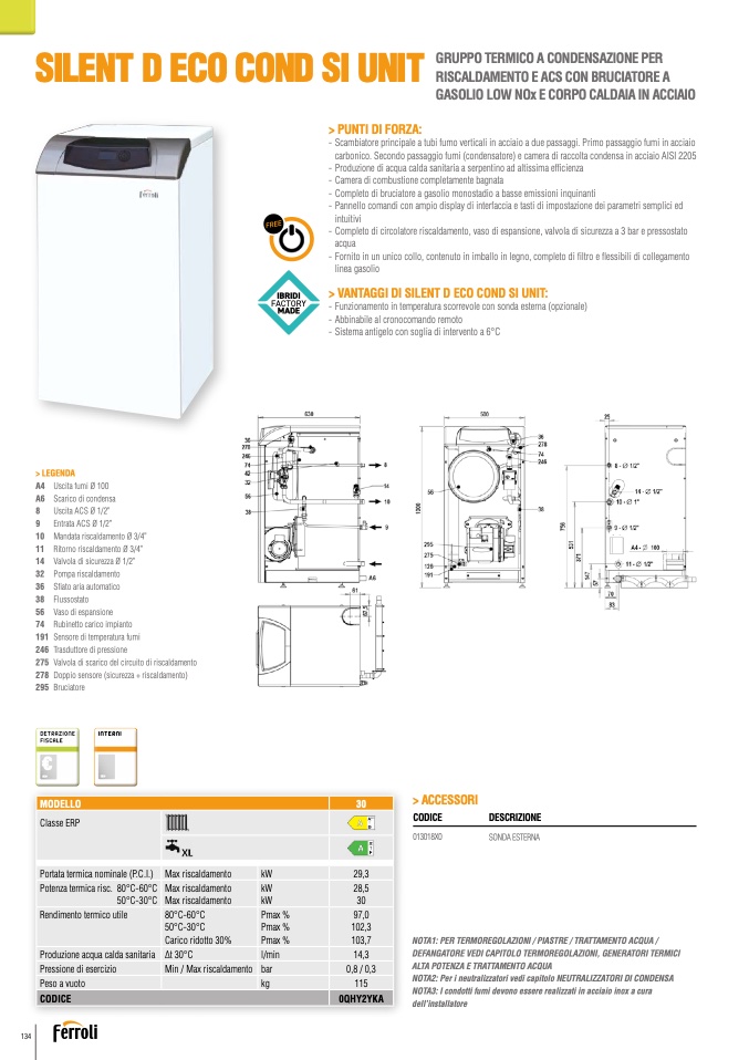 - Completo di circolatore riscaldamento, vaso di espansione, valvola di sicurezza a 3 bar e pressostato