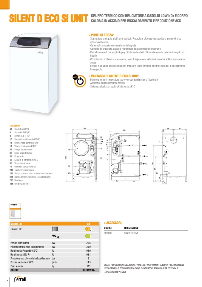 - Completo di circolatore riscaldamento, vaso di espansione, valvola di sicurezza a 3 bar e pressostato
