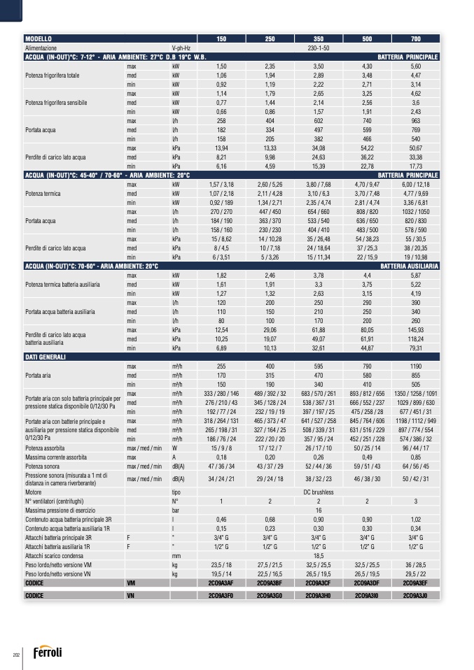 ACQUA (IN-OUT)°C: 45-40° / 70-60° - ARIA AMBIENTE: 20°C