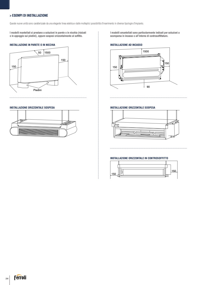 o in appoggio sui piedini), oppure sospesi orizzontalmente al soffitto.