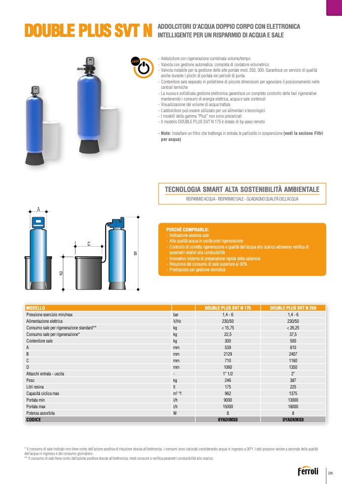 * Il consumo di sale indicato non tiene conto dell’azione positiva di riduzione dovuta all’elettronica. I consumi sono calcolati considerando acqua in ingresso a 30°f. I dati possono variare a seconda della qualit