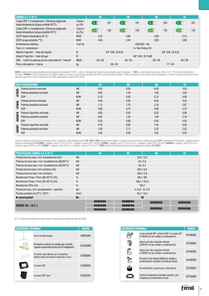 impianto : acqua in 23°C out 18°C A35W7 = sorgente : aria in 35°C b.s. / impianto : acqua in 12°C out 7°C NOTE: Classe di ef