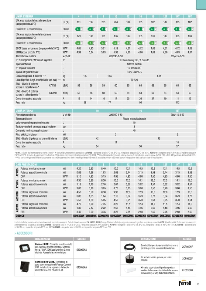 potenza termica su potenza assorbita A7W35 = sorgente : aria in 7°C b.s. 6°C b.u. / impianto : acqua in 30°C out 35°C A7W45 = sorgente : aria in 7°C b.s. 6°C b.u. / impianto : acqua in 40°C out 45°C A35W18 = sorgente : aria