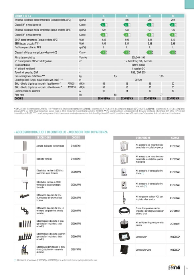 W con unità funzionante in condizioni: A7W35 = sorgente: aria in 7°C b.s. 6°C b.u. / impianto: acqua in 30°C out 35°C. A35W18 = sorgente: aria in 35°C b.s. / impianto: