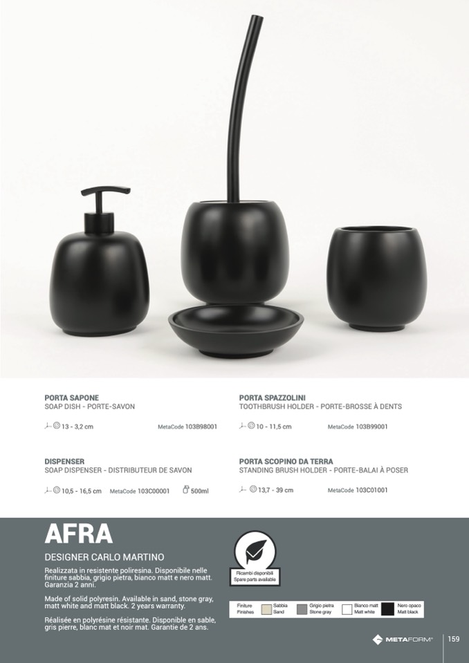 finiture sabbia, grigio pietra, bianco matt e nero matt.