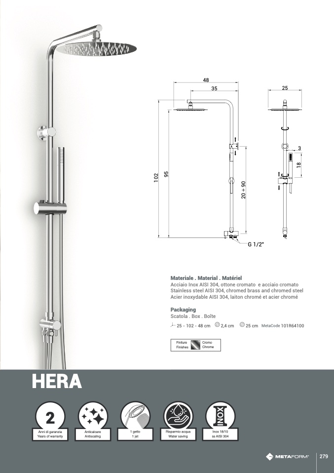 Stainless steel AISI 304, chromed brass and chromed steel