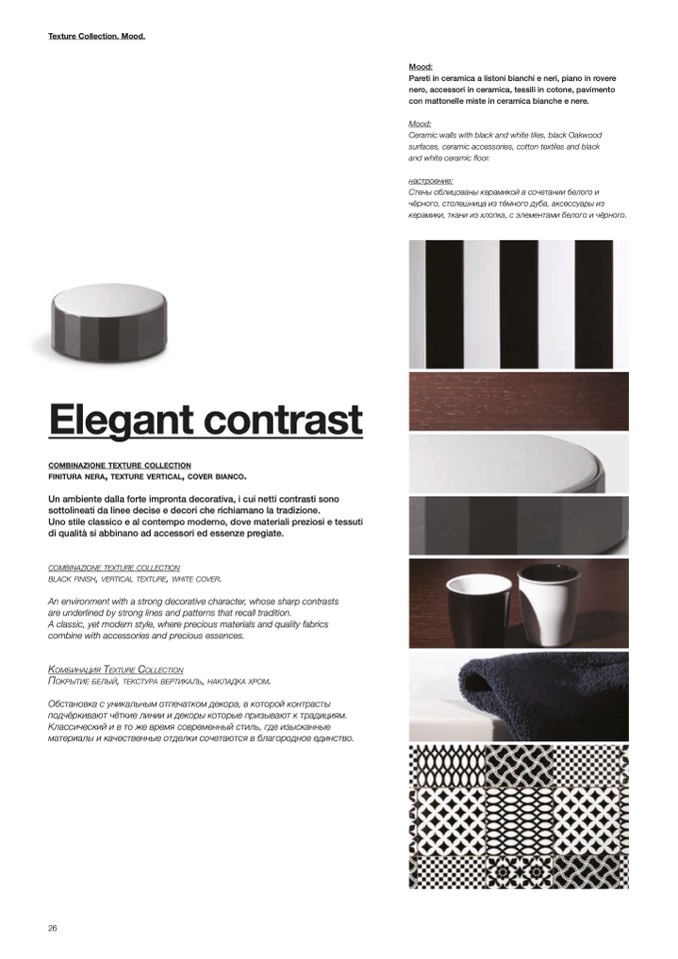 керамики, ткани из хлопка, с элементами белого и чёрного.