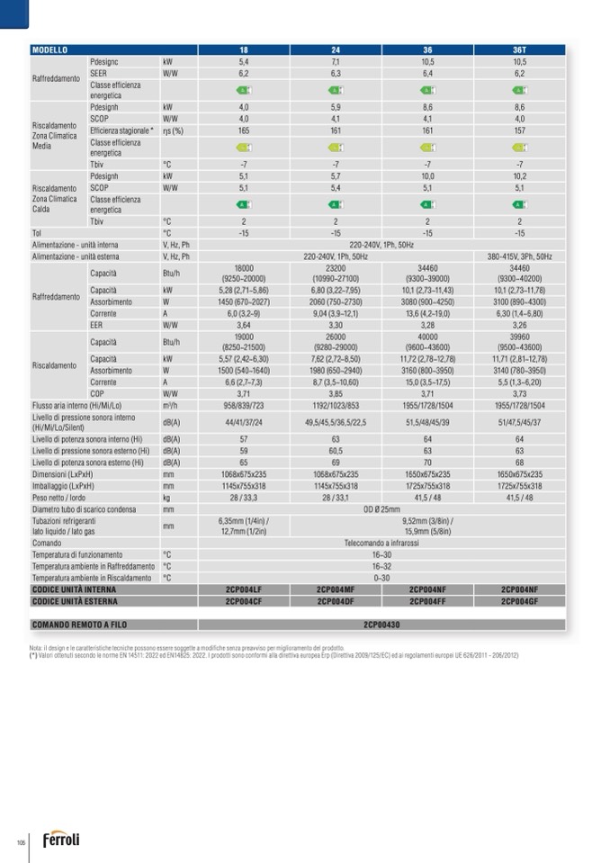 (*) Valori ottenuti secondo le norme EN 14511: 2022 ed EN14825: 2022. I prodotti sono conformi alla direttiva europea Erp (Direttiva 2009/125/EC) ed ai regolamenti europei UE 626/2011 - 206/2012)