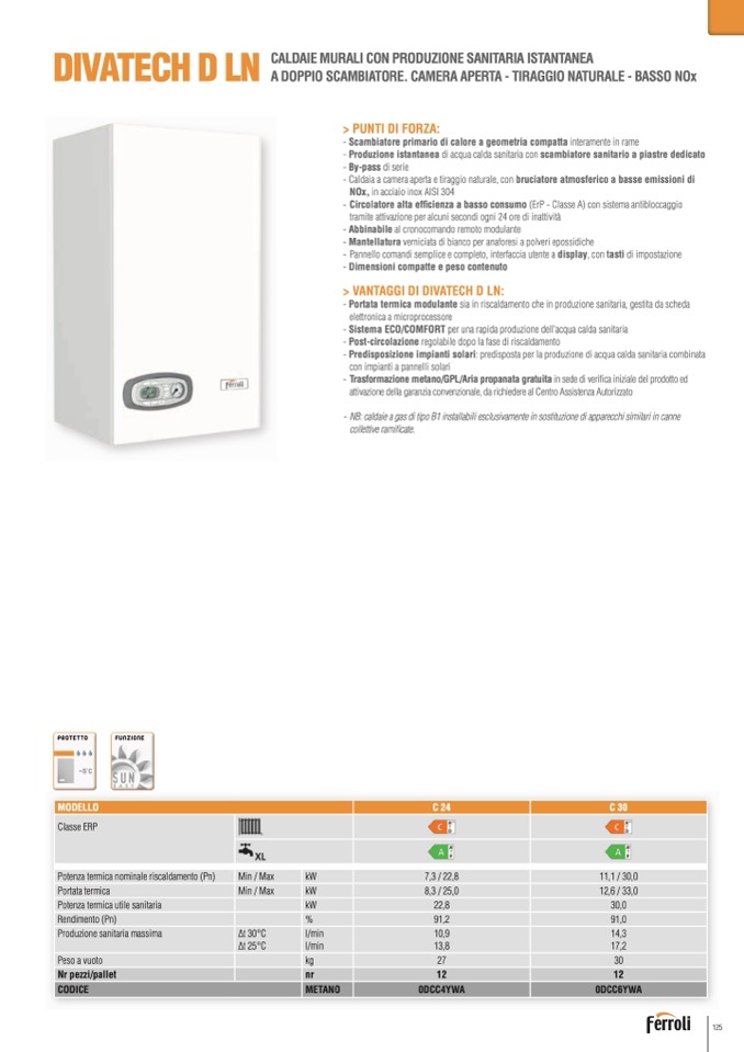 - Portata termica modulante sia in riscaldamento che in produzione sanitaria, gestita da sched
