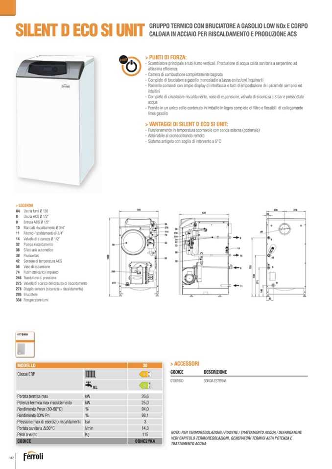 - Completo di circolatore riscaldamento, vaso di espansione, valvola di sicurezza a 3 bar e pressostato