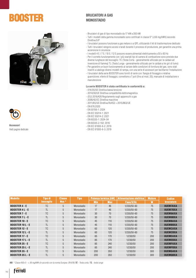 NB: * Classe NOx 5 - ≤ 56 mg/kWh (in accordo con la norma Europea EN 676) TC - Testa corta / TL - testa lung