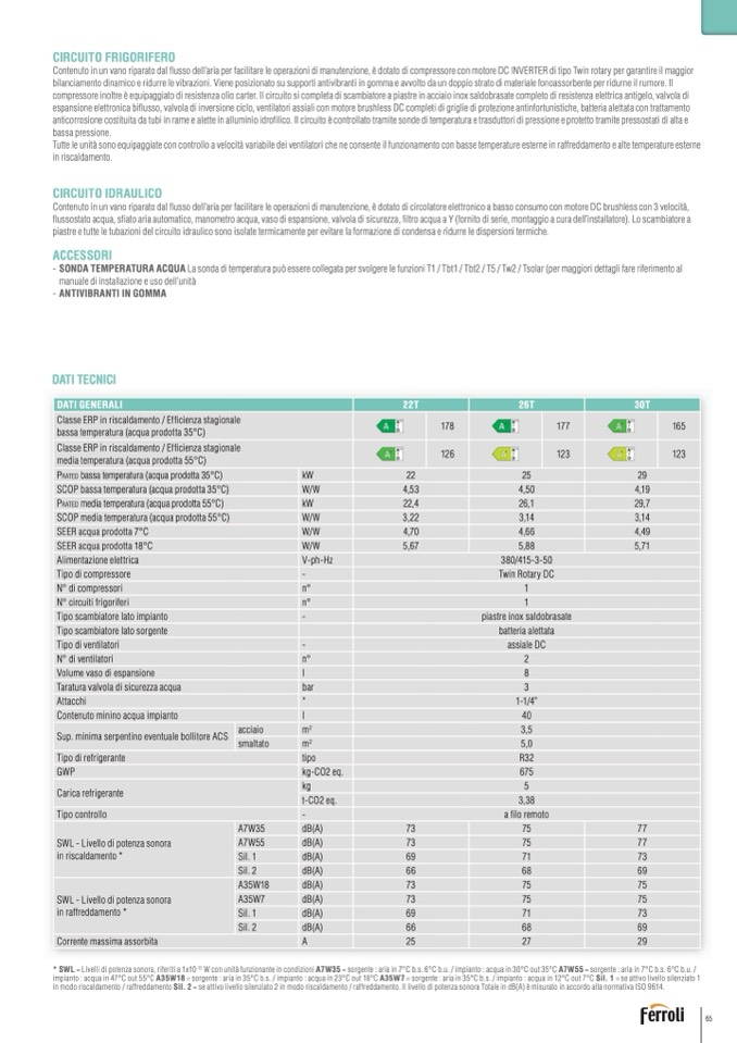 * SWL = Livelli di potenza sonora, riferiti a 1x10-12 W con unità funzionante in condizioni A7W35 = sorgente : aria in 7°C b.s. 6°C b.u. / impianto : acqua in 30°C out 35°C A7W55 = sorgente : aria in 7°C b.s. 6°C b.u.