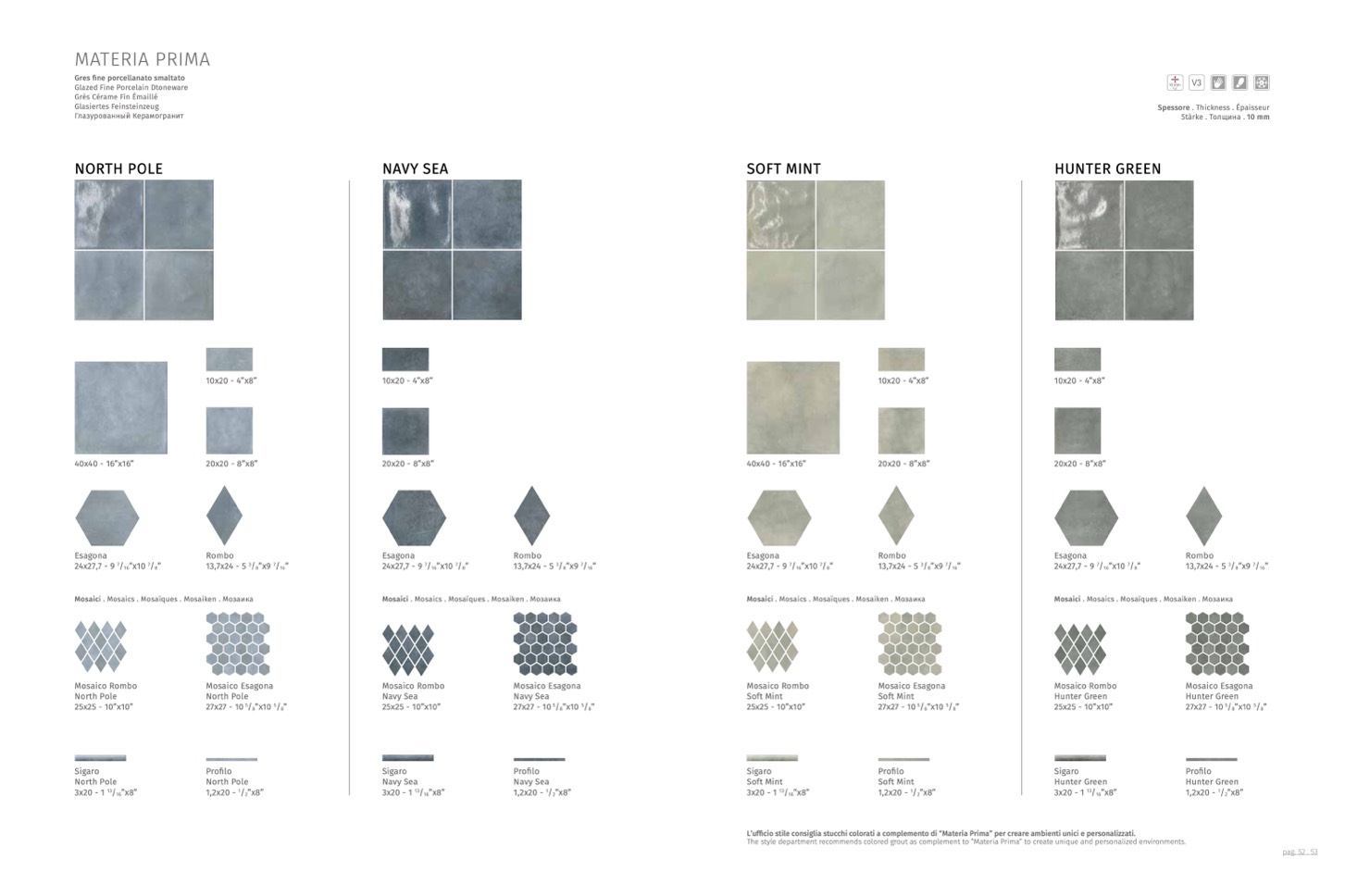 The style department recommends colored grout as complement to “Materia Prima” to create unique and personalized environments.