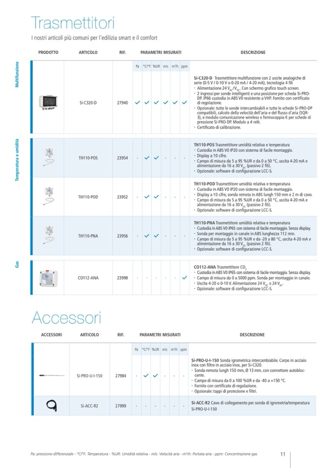 ∙ Campo di misura da 5 a 95 %UR e da -20 a 80 °C, uscita 4-20 mA e