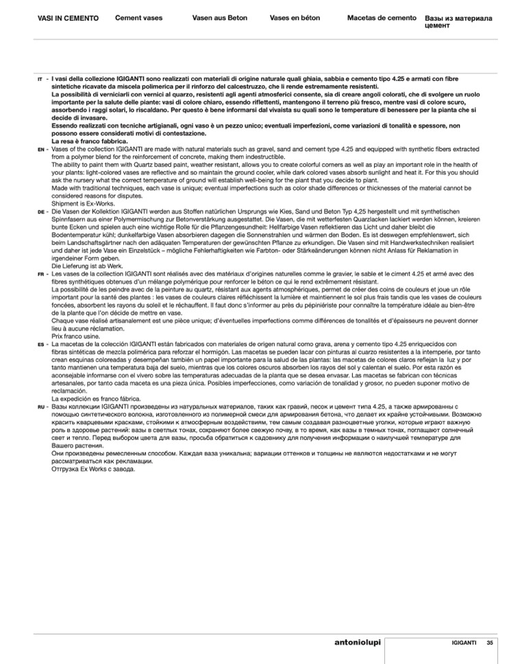 La macetas de la colección IGIGANTI están fabricados con materiales de origen natural como grava, arena y cemento tipo 4.25 enriquecidos con