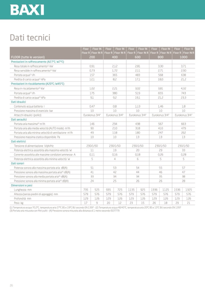 (1) Temperatura acqua 7/12°C, temperatura aria 27°C BS e 19°C BU secondo EN 1397 - (2) Temperatura acqua 40/45°C, temperatura aria 20°C BS e 15°C BU secondo EN 1397