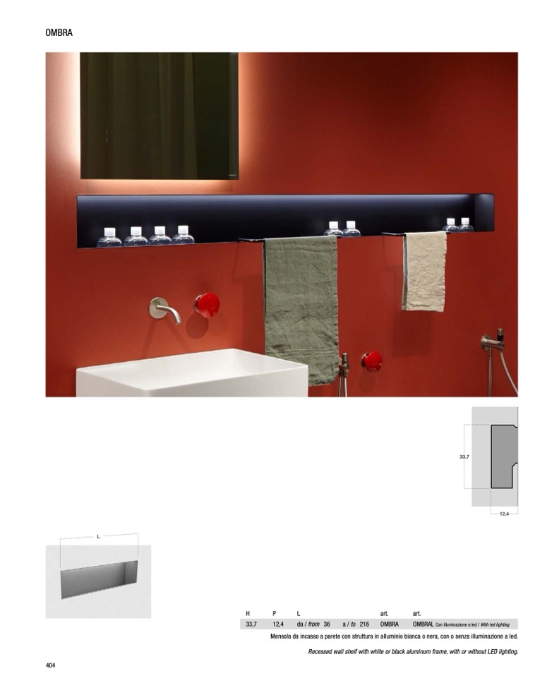 Recessed wall shelf with white or black aluminum frame, with or without LED lighting.