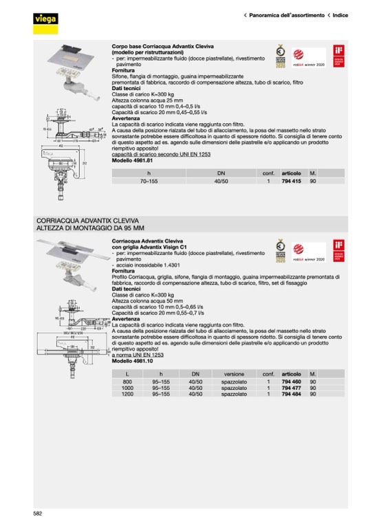 Profilo Corriacqua, griglia, sifone, flangia di montaggio, guaina impermeabilizzante premontata di