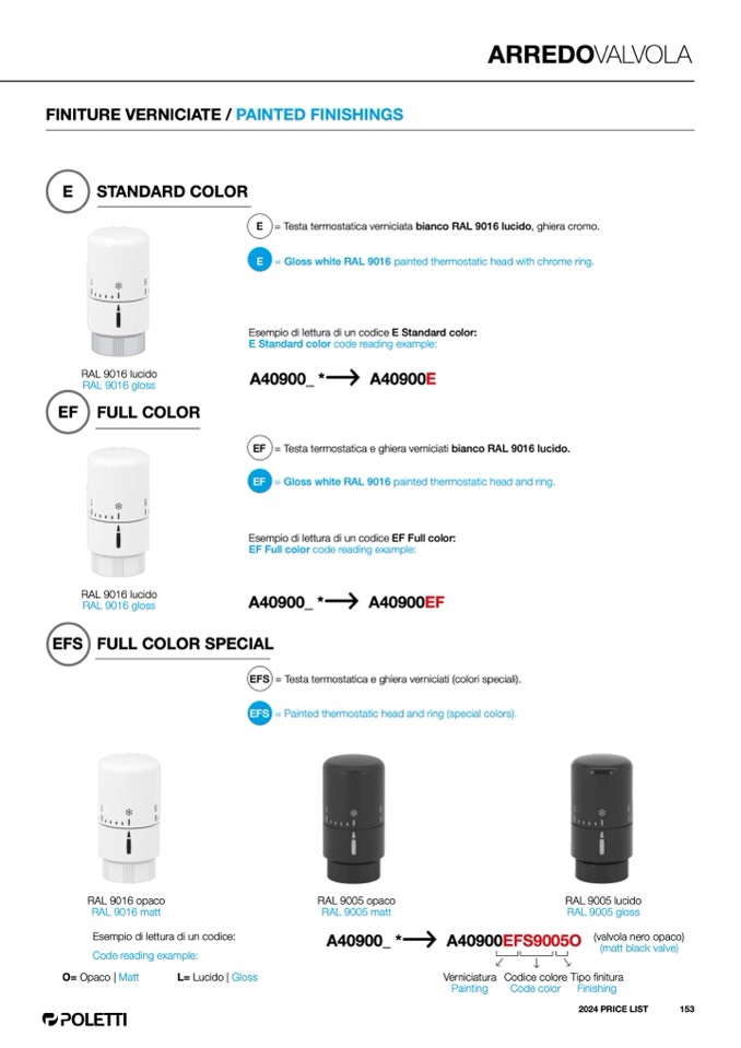 EFS = Testa termostatica e ghiera verniciati (colori speciali).