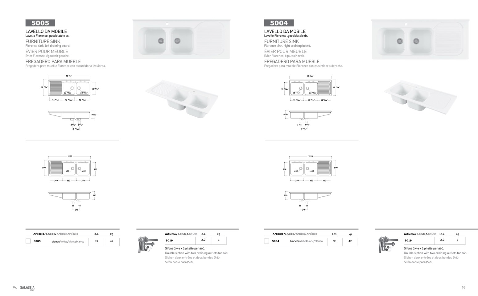 Double siphon with two draining outlets for ø60.