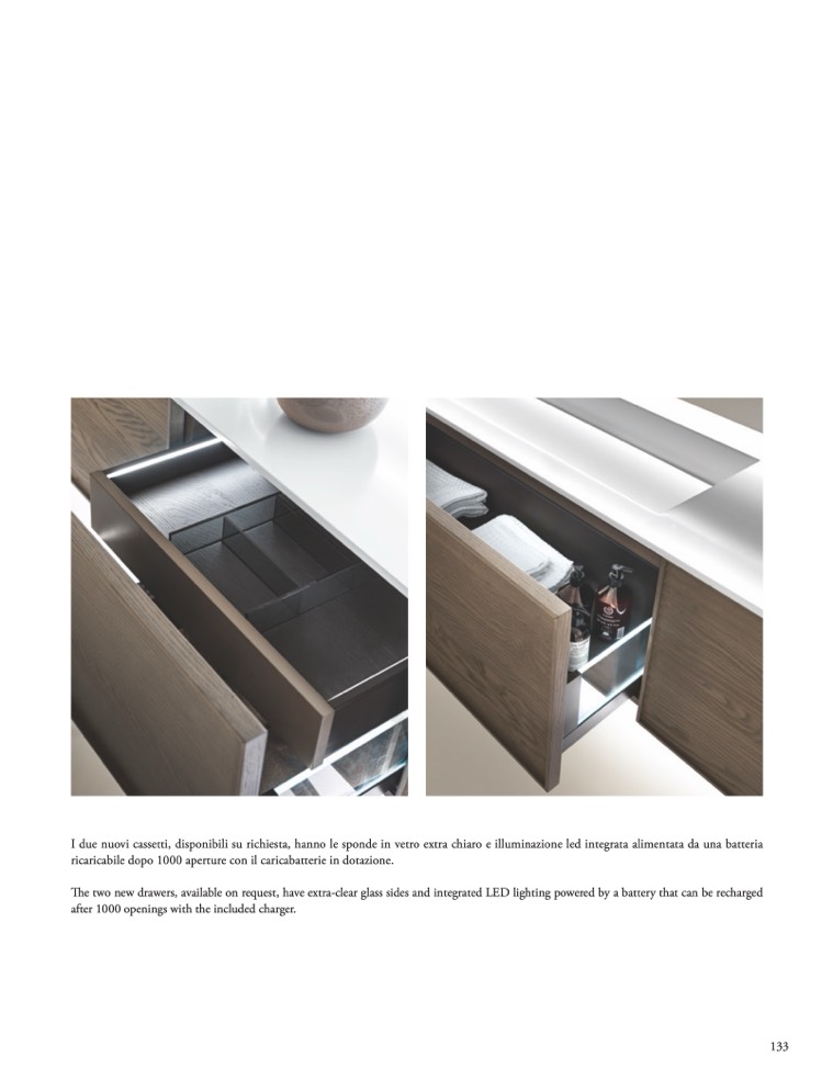 The two new drawers, available on request, have extra-clear glass sides and integrated LED lighting powered by a battery that can be recharged