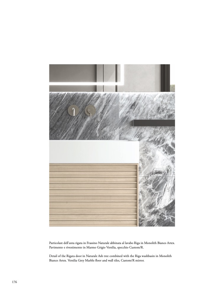 Particolare dell’anta rigata in Frassino Naturale abbinata al lavabo Riga in Monolith Bianco Artex.
