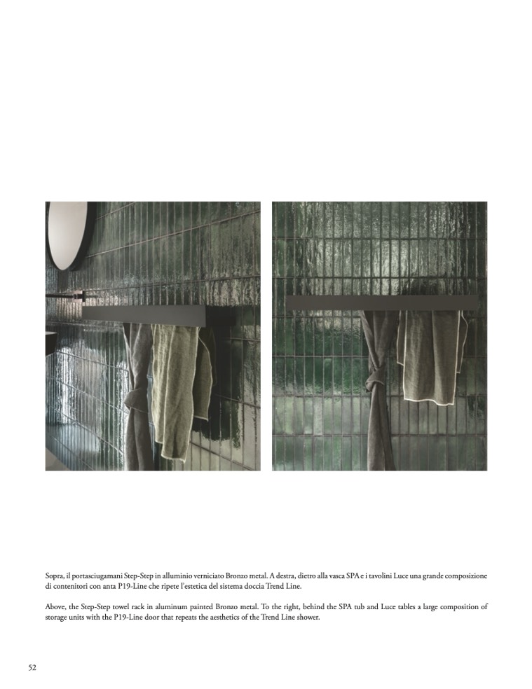 Above, the Step-Step towel rack in aluminum painted Bronzo metal. To the right, behind the SPA tub and Luce tables a large composition of
