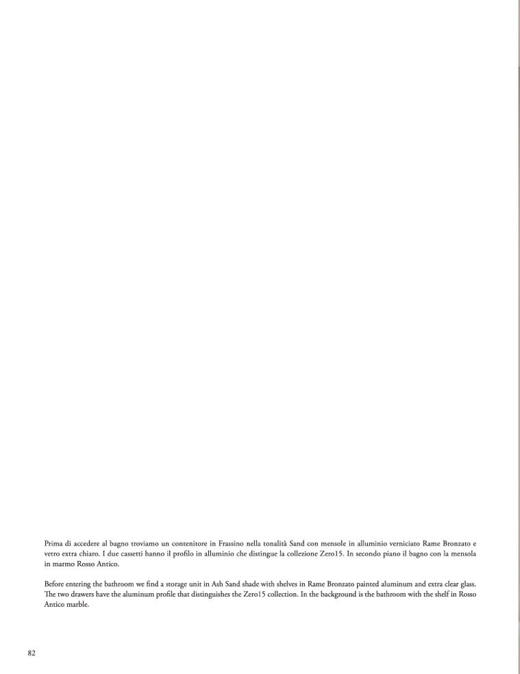 Prima di accedere al bagno troviamo un contenitore in Frassino nella tonalità Sand con mensole in alluminio verniciato Rame Bronzato e