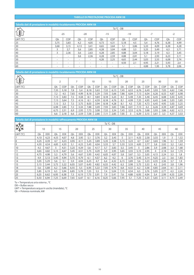Tabella dati di prestazione in modalità riscaldamento PROCIDA AWM X8