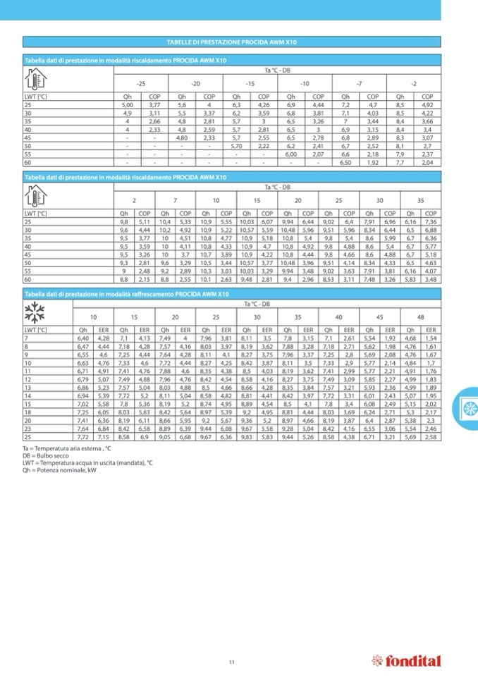 Tabella dati di prestazione in modalità raffrescamento PROCIDA AWM X10