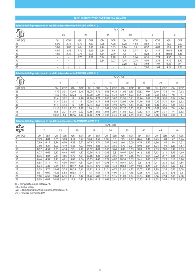 Tabella dati di prestazione in modalità riscaldamento PROCIDA AWM X12