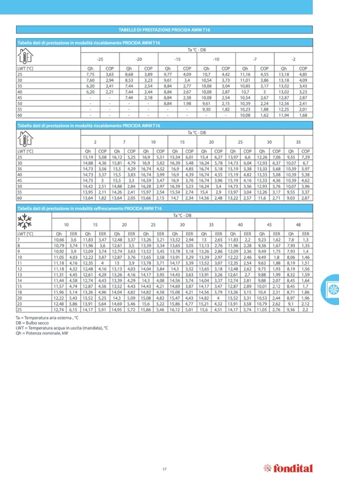 Tabella dati di prestazione in modalità raffrescamento PROCIDA AWM T16
