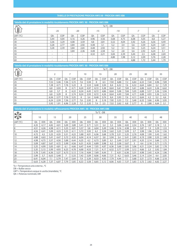 Tabella dati di prestazione in modalità riscaldamento PROCIDA AWS X8 - PROCIDA AWS XB8