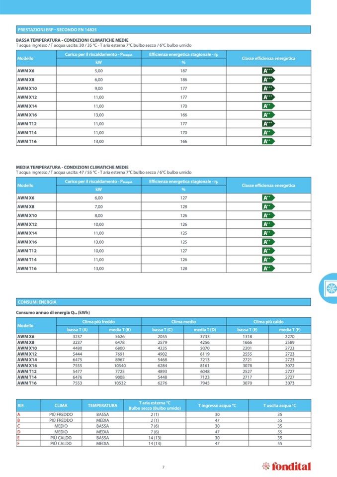 T acqua ingresso / T acqua uscita: 30 / 35 °C - T aria esterna 7°C bulbo secco / 6°C bulbo umido