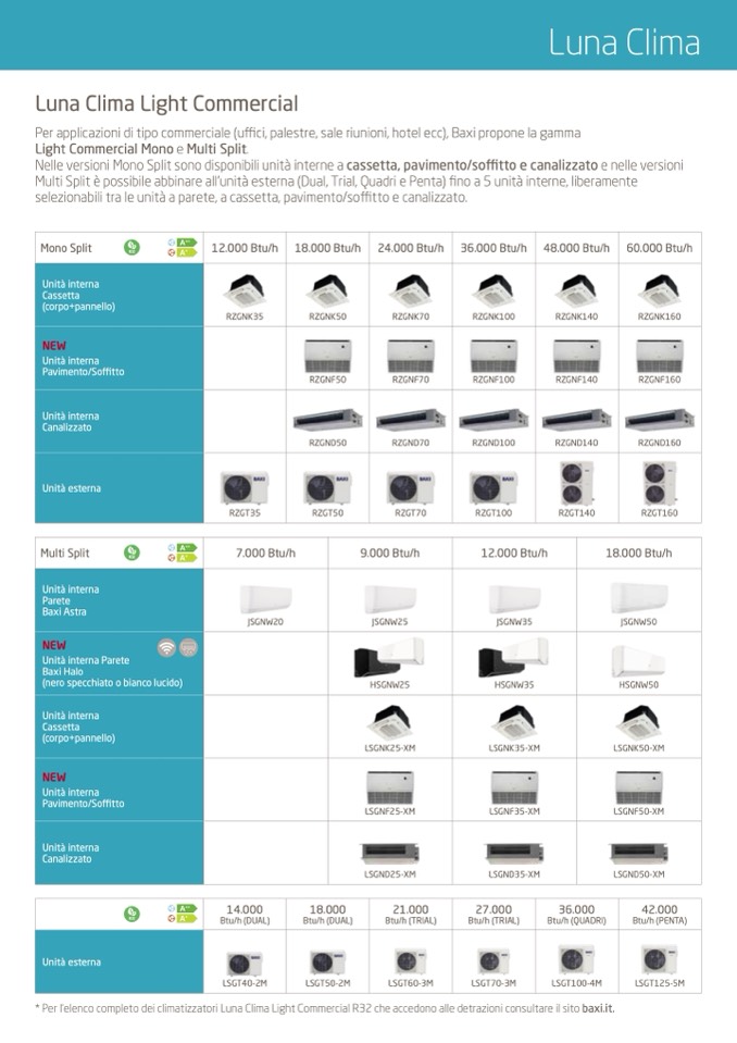 * Per l'elenco completo dei climatizzatori Luna Clima Light Commercial R32 che accedono alle detrazioni consultare il sito baxi.it.