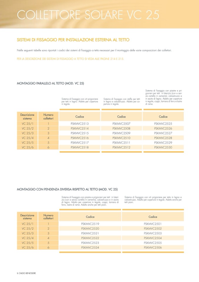 Nelle seguenti tabelle sono riportati i codici dei sistemi di fissaggio a tetto necessari per il montaggio delle varie composizioni dei collettori.
