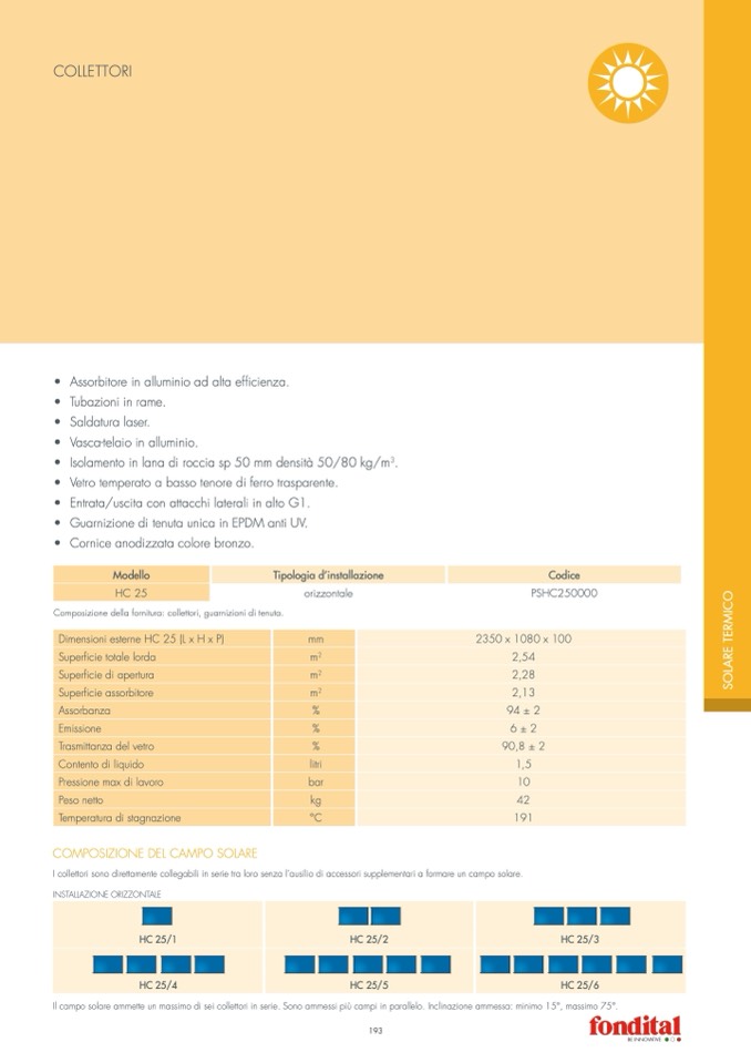 Il campo solare ammette un massimo di sei collettori in serie. Sono ammessi più campi in parallelo. Inclinazione ammessa: minimo 15°, massimo 75°.