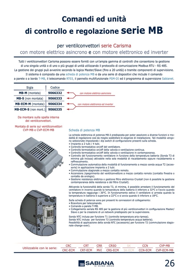 a parete o a bordo T-MB, il telecomando RT03, il pannello multifunzionale PSM-DI ed il programma di supervisione Sabianet.