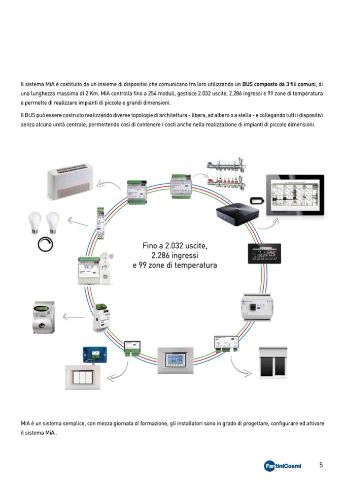 una lunghezza massima di 2 Km. MiA controlla fino a 254 moduli, gestisce 2.032 uscite, 2.286 ingressi e 99 zone di temperatura