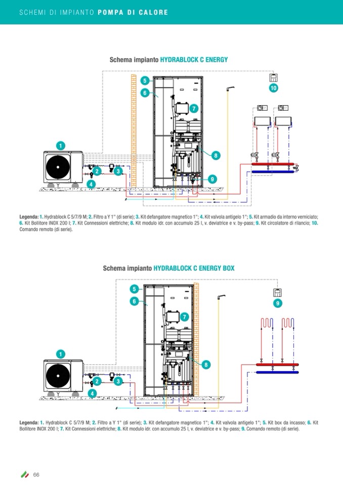 Legenda: 1. Hydrablock C 5/7/9 M; 2. Filtro a Y 1" (di serie); 3. Kit defangatore magnetico 1"; 4. Kit valvola antigelo 1"; 5. Kit box da incasso; 6. Kit