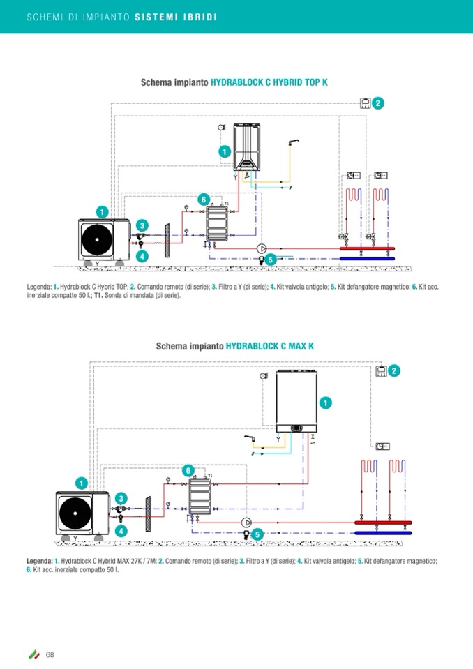 Legenda: 1. Hydrablock C Hybrid TOP; 2. Comando remoto (di serie); 3. Filtro a Y (di serie); 4. Kit valvola antigelo; 5. Kit defangatore magnetico; 6. Kit acc.