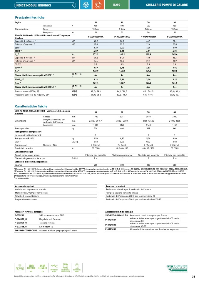 1) Secondo EN 14511-2013: temperatura di ingresso/uscita dell'acqua fredda: 12/7 °C, temperatura ambiente esterna 35 °C B.S. (2) Secondo EN 14825 e il REGOLAMENTO (UE) 2016/2281 DELLA COMMISSIONE