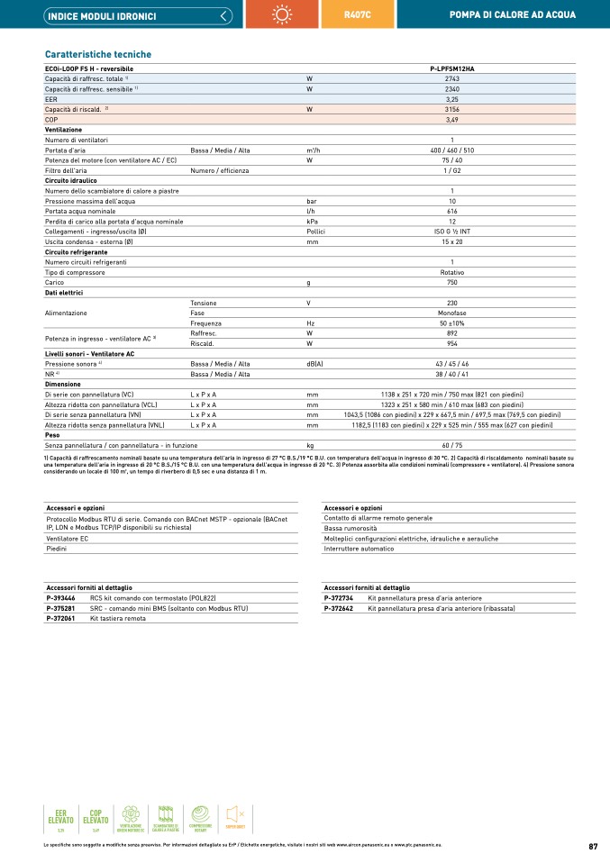 1) Capacità di raffrescamento nominali basate su una temperatura dell'aria in ingresso di 27 °C B.S./19 °C B.U. con temperatura dell'acqua in ingresso di 30 °C. 2) Capacità di riscaldamento