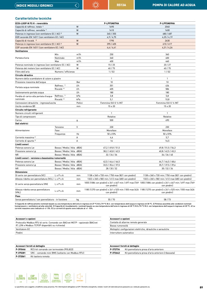 1) Capacità di raffrescamento nominali basate su una temperatura dell'aria in ingresso di 27 °C B.S./19 °C B.U. con temperatura dell'acqua in ingresso di 30 °C. 2) Potenza assorbita alle condizioni nominali