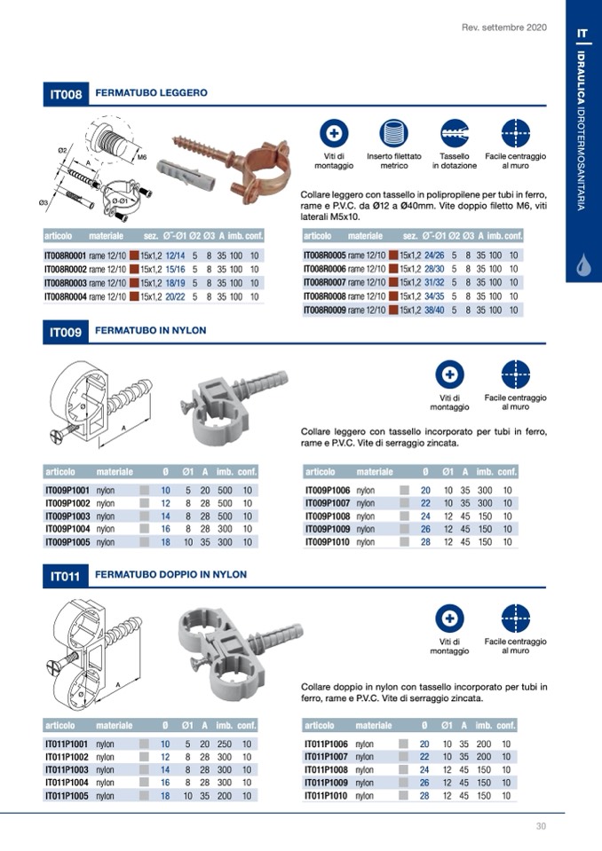 rame e P.V.C. da Ø12 a Ø40mm. Vite doppio filetto M6, viti