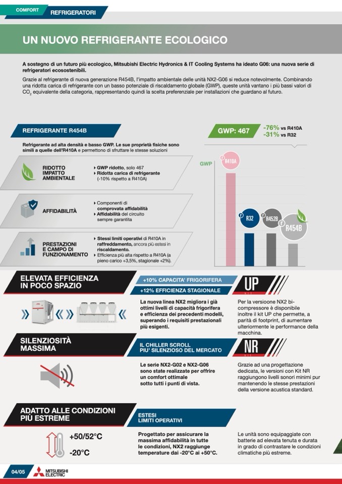 Grazie al refrigerante di nuova generazione R454B, l’impatto ambientale delle unità NX2-G06 si reduce notevolmente. Combinando