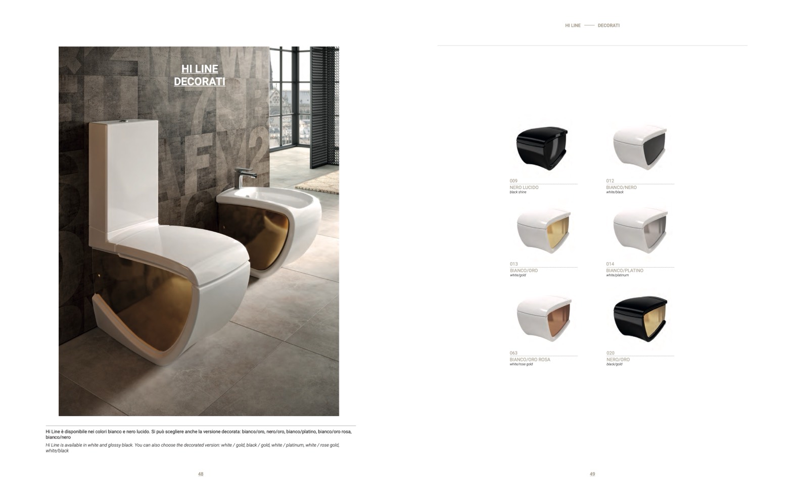 Hi Line è disponibile nei colori bianco e nero lucido. Si può scegliere anche la versione decorata: bianco/oro, nero/oro, bianco/platino, bianco/oro rosa,