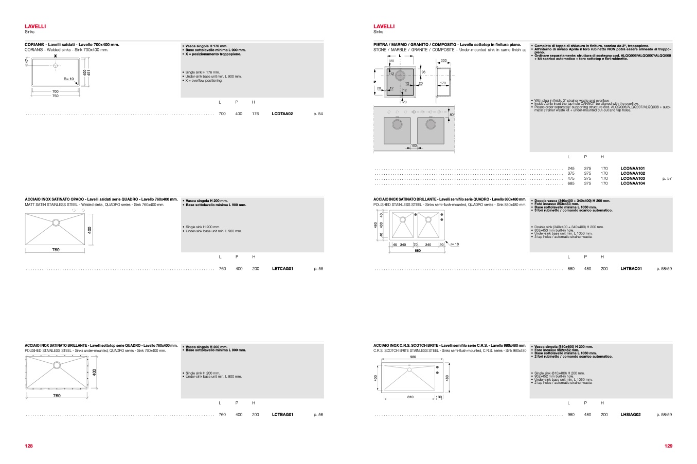 ACCIAIO INOX SATINATO BRILLANTE - Lavelli sottotop serie QUADRO - Lavello 760x400 mm.