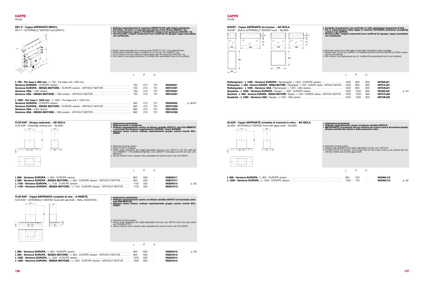 • Versione USA: i singoli componenti sono certificati UL (gruppo cappa assemblato