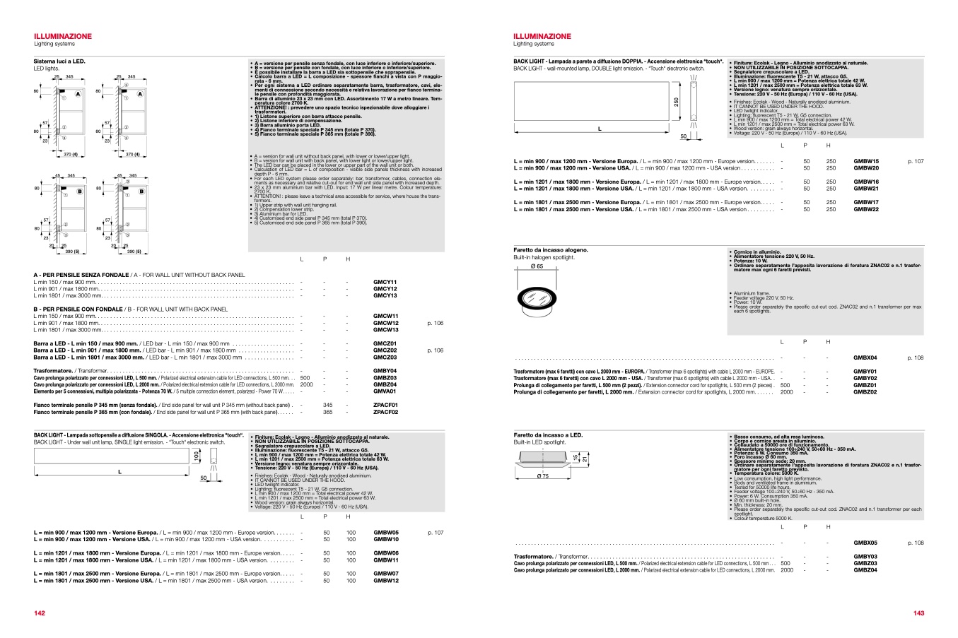 • B = version for wall unit with back panel, with lower light or lower/upper light.